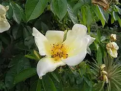 Rosa bracteata, con una altura de 4 a 5 metros, con numerosas flores blancas y aroma cítrico, se originó en China e India, se introdujo en Inglaterra en 1793 por Lord Macartney.