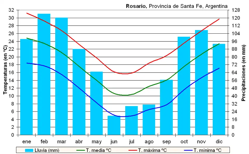 El clima de Rosario es subtropical húmedo (también se lo llama clima pampeano). Por fuera del ejido urbano del Gran Rosario, se clasifica como clima templado pampeano, es decir que las cuatro estaciones están definidas, aunque su invierno es bastante irregular: durante esa estación se observan tanto días fríos, como frescos, templados, y muy ocasionalmente cálidos.[31][32][33][34][35][36][37][38][39][40]​ Es muy común que durante los meses invernales haya días en donde la temperatura máxima supere los 20 °C. La temperatura mínima absoluta (registro 1940-2021) fue de -11,1 °C el 13 de junio de 1967; y, la temperatura máxima absoluta de 42,4 °C el 21 de enero de 1943, mientras que el 31 de diciembre de 1938 ascendió a 42,1 °C y el 9 de enero de 2006 40,1 °C.[41]