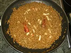 Un rossejat, según el diccionario (arrossejat[6] no aparece en ninguno), es un guiso de arroz, carne y otros ingredientes, cocido en casa y tostado al horno.[7]