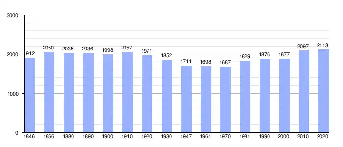 La población total del municipio, al 1 de diciembre de 2019, era de 2.106 habitantes, 1.040 mujeres y 1.066 hombres, para una superficie total de 27,68 km², lo que arroja una densidad poblacional de aproximadamente 76,08 habitantes. por km².
