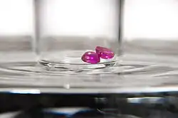 - El segundo proceso de calentamiento en un horno eléctrico con diferentes aditivos químicos. Diferentes soluciones y mezclas han dado buenos resultados, aunque en la actualidad se utiliza sobre todo polvo de vidrio que contiene plomo. El rubí se sumerge en aceites, luego se cubre de polvo, se incrusta en una baldosa y se introduce en el horno, donde se calienta a unos 900 °C (1600 °F) durante una hora en una atmósfera oxidante. El polvo de color naranja se transforma al calentarse en una pasta de color transparente a amarillo, que rellena todas las fracturas. Tras enfriarse, el color de la pasta es totalmente transparente y mejora notablemente la transparencia general del rubí.[18]