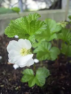 Es una especie perenne rizomatosa, de hoja caducifolia que alcanza entre 5-30 cm de altura con tallos algo leñosos y erectos. Las hojas son alternas, con 5 a 7 lóbulos suavemente indentadas (parecidas a manos) y márgenes serrados; el envés es pubescente y el haz ligeramente piloso o glabro. Inflorescencia terminal con una sola flor unisexual de 2-3 cm de diámetro, con 4-5 pétalos blancos. El fruto es un eterio (como la mora) subgloboso de 1 cm aproximadamente, de color anaranjado rojizo que se torna marrón amarillento al madurar. Florece de mayo a julio y fructifica entre agosto y septiembre.[1]