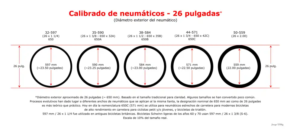 No obstante, un neumático 26 x 2 (ISO 50-559) mide ~ 26 pulgadas de diámetro, o sea; 559mm (22 pulgadas) diámetro de la llanta + (102mm) (4 pulgadas) del neumático a lo largo de la circunferencia = 26 pulgadas.