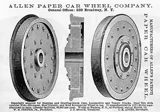 Las ruedas con interior de papel fueron inventadas por el ingeniero de locomotoras estadounidense Richard N. Allen (1827-1890),[4] quien estableció una compañía con su cuñado en 1867, produciendo papel a partir de la paja de los cereales.[5] Amortiguaban las vibraciones mucho mejor que las ruedas de ferrocarril de hierro fundido convencionales, que transmiten todas las imperfecciones de la vía al coche situado por encima, haciendo que los viajes en tren fuesen ruidosos e incómodos.[1] Fueron especialmente utilizadas en los coches comedor y en los coches cama de la compañía Pullman,[6][7] aunque ocasionalmente fueron criticadas por causar descarrilamientos. En 1915, la Comisión de Comercio Interestatal, que regulaba los ferrocarriles estadounidenses, declaró que las ruedas de papel no eran seguras, y dejaron de usarse en los vagones de ferrocarril de los Estados Unidos.[3]
