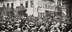 Ya el 1 de octubre de 1914, el Gobierno ruso se comprometió a admitir la anexión rumana de los territorios austrohúngaros de población rumana, siempre que fuesen conquistados por la propia Rumania y a respetar la integridad territorial del país, a cambio simplemente de que Rumania siguiese siendo neutral en la guerra.[135][136][137][113] La oferta alemana era escasa dadas las grandes ambiciones territoriales de los rumanos, que únicamente grandes cesiones de los austrohúngaros podían satisfacer.[111] La meta del Gobierno era obtener la mayor extensión posible de los territorios ansiados de la participación en la contienda mundial.[73] Brătianu, que se guio en todo momento por lo que consideraba los intereses del país, pretendía aprovechar la guerra para rematar la «unidad nacional».[138] Al principio, los rumanos optaron por permanecer neutrales y observar el curso de la guerra,[105][106] para asegurarse por qué bando se decantaba la victoria.[67][139][128] Mientras continuaba negociando con los dos bandos, el país vendía víveres a los Imperios Centrales a alto precio.[67][140][nota 9] Las dos coaliciones enfrentadas empleaban también la propaganda y el soborno de la prensa, muy venal, y a los políticos para ganarse a la opinión pública y atraer al país a la guerra.[141]