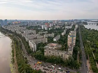 | Vista general de los edificios de apartamentos Rusanivka, de 5 a 25 pisos, desde la orilla derecha del Dnieper | ||