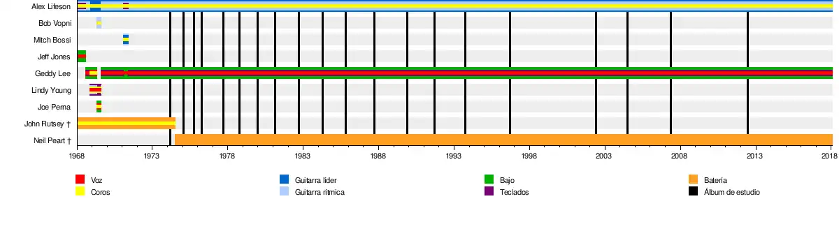 - Geddy Lee – bajo, voz, teclados, sintetizadores, melotrón, pedales de bajo y sintetizador, guitarra adicional (septiembre de 1968 - mayo de 1969, julio de 1969 - 2018)