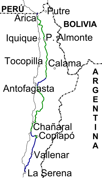 - Provincia del Tamarugal: Huara (km 1840-1839), Pozo Almonte (km 1806-1810), aduana de Quillagua (km 1642).
