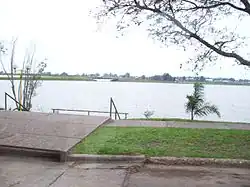 Sobre el tramo inundado de la ex-Ruta Nacional 14 entre la vieja ciudad de Federación y la nueva se construyó en 1985 un terraplén y un puente metálico.