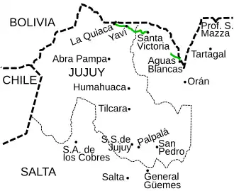 - Departamento Yavi: Suripugio (km 279), Yavi (km 293) y La Quiaca (km 310).