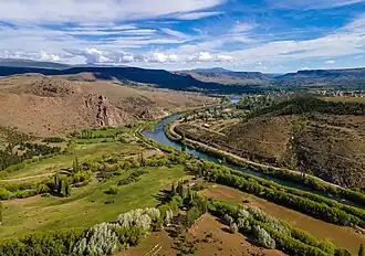 ![]() Vista de la ruta en el Valle del Río Aluminé, al norte de la localidad homónima. | |||||||||