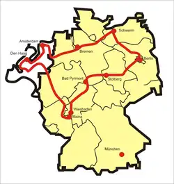La ruta comienza en Países Bajos, de ahí, atraviesa luego los estados alemanes de Renania del Norte-Westfalia, Renania-Palatinado en dirección sur, gira hacia el noreste por Hesse, Baja Sajonia, Sajonia-Anhalt, Brandeburgo y Berlín, donde gira hacia el noroeste a Mecklemburgo-Pomerania Occidental, y finalmente hacia el suroeste por Schleswig-Holstein, de nuevo Baja Sajonia, y Bremen regresando a Países Bajos.[1]