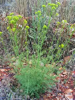 Planta fuertemente aromática, algo azulada, sin pelos, algo leñosa por abajo, de 25-70 cm, con hojas divididas profundamente dos o tres veces, formando segmentos alargados y muy finos. Las flores son primaverales, amarillas, poco abiertas, de menos de 1 cm, agrupadas densamente al extremo de las ramas, con 4 pétalos de borde algo ondulado en su punta. Es una planta venenosa, abortiva, medicinal reputada, aunque no tanto como alguna otra especie de su mismo género. Su aroma, que desagrada a muchas personas, permanece en las manos después incluso de ser lavadas.[1] Cápsulas de 1,5-3mm, con pedicelo corto y 4-5 lóbulos muy marcados. Florece y fructifica de primavera a verano.[2]