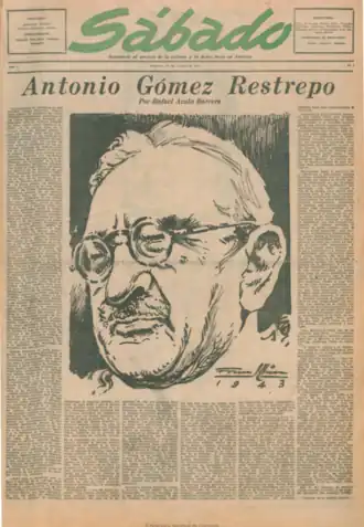 Apareció en Bogotá el 17 de julio de 1943[2] y se caracterizó por la publicación crítica en temas culturales, políticos, económicos y relacionados con la literatura como poesía, cuento y ensayos.[3] Además, uno de los principales aspectos de Sábado fue el hecho de que sus publicaciones no estaban limitadas al ámbito nacional colombiano. Si bien los temas con respecto a Colombia tenían importancia y primacía, el periódico se dedicó también a la publicación de autores extranjeros así como de temas coyunturales e internacionales para la época. Por ello, contaba con poemas del español Federico García Lorca,[4] del mexicano Amado Nervo,[5] del chileno Pablo Neruda[6][7] y cuentos de autores como Edgar Allan Poe.[8]