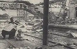 Wong bajó del techo a la calle, en donde entró a su carro y se dirigió rápidamente a la destruida estación de trenes. Al llegar, observó la carnicería y la confusión: "Fue algo horrible. La gente aún estaba tratando de volver a pararse. Muertos y heridos estaban tirados a lo largo de la plataforma y las vías. Había extremidades por todos lados. Sólo mi trabajo me hizo olvidar lo que estaba viendo. Pare para precargar mi cámara. Me di cuenta que mis zapatos estaban empapados de sangre. Caminé hacia el otro lado de las vías, y tomé varias escenas largas con el puente en llamas en el fondo. Luego ví a un hombre alzar a un bebé de las vías y llevarlo a la plataforma. Volvió para recoger a otro bebé malherido. La madre estaba muerta en las vías. Mientras filmaba esta tragedia, escuché el sonido de los aviones regresando. Rápidamente, utilicé los últimos pies [de rollo fotográfico] en el bebé. Corrí hacia el niño, con la intención de llevarlo a un lugar seguro, pero el padre regresó. Los bombarderos pasaron por encima. No soltaron ninguna bomba."[11]