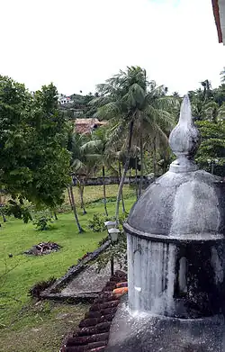 La iglesia posee un pórtico formado por cuatro arcos de piedra. En la parte superior, el frontón está formado por volutas y posee un nicho en su centro.