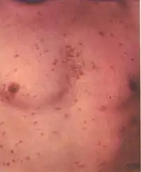 La sífilis, llamada antiguamente morbo gálico, mal francés o bubas, es una enfermedad sistémica infecciosa transmitida principalmente por contacto sexual, producida por la bacteria espiroqueta Treponema pallidum, subespecie pallidum. Sus manifestaciones clínicas son de características e intensidad fluctuantes, apareciendo y desapareciendo en las distintas etapas de la enfermedad: primaria, secundaria, latente o terciaria.[1][2] La etapa primaria se presenta clásicamente con un único chancro (una úlcera cutánea firme, indolora y que no produce picazón, generalmente entre 1 cm y 2 cm de diámetro) en los genitales o en la boca,[3] aunque puede haber múltiples llagas en otras partes del cuerpo.[2] En la sífilis secundaria, que ocurre generalmente entre 4 y 10 semanas después de la infección primaria y que involucra la propagación de la bacteria a través del torrente sanguíneo,[3] ocurre un sarpullido difuso, que con frecuencia involucra las palmas de las manos y las plantas de los pies.[2] También pueden presentarse llagas en la boca o en la vagina.[2] Asimismo pueden ocurrir síntomas similares a los de la gripe.[3] La sífilis latente es asintomática y puede durar años.[2] En la sífilis terciaria aparecen gomas (neoplasias suaves y no cancerosas), problemas neurológicos o síntomas cardíacos.[4] La neurosífilis, que involucra la infección del sistema nervioso central, puede ocurrir en cualquier etapa de la infección y puede causar meningitis, accidentes cerebrovasculares, perdida de la audición, ceguera, parálisis o demencia si no es tratada.[3] La sífilis ha sido llamada «La gran imitadora», debido a que puede causar síntomas similares a los de muchas otras enfermedades.[2][4] Puede producir lesiones en el sistema nervioso y en el aparato circulatorio si no se trata a tiempo. Existe en todo el mundo y se ha descrito desde hace siglos.[5][6] Una investigación llevada a cabo y publicada en diciembre de 2024, sitúa el origen de la enfermedad en América desde la era precolombina.[7]