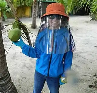 ![]() Niño con xeroderma pigmentosa (uno de los síntomas de De Sanctis-Cacchione) vistiendo ropa protectora contra rayos UV. | ||