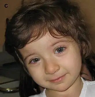 La mayoría de los niños afectados presentan retrasos en las etapas del desarrollo (sentarse, gatear, caminar, hablar, etc.) y retraso psicomotor (retrasos en la adquisición de habilidades que requieran coordinación de la actividad muscular y mental). Las anomalías craneofaciales pueden incluir microcefalia (cabeza anormalmente pequeña), bóveda del paladar arqueada y micrognatia (mandíbula muy pequeña), estrabismo (mirada desviada), ptosis palpebral (párpados caídos), pliegues antimongoloides (formación de pliegues por inclinación de los párpados hacia abajo) y epicantus (pliegue adicional de la piel de cualquier lado de la nariz sobre las esquinas internas de los ojos); estrabismo (desviación de uno de los ojos de su dirección normal, por lo que los ejes visuales no pueden dirigirse en un mismo tiempo al mismo punto), astigmatismo (defecto en la curvatura del cristalino, de forma que los rayos paralelos quedan enfocados por detrás de la retina) y clinodactilia del quinto dedo (arqueamiento permanente de un dedo).