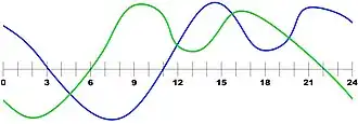 ![]() Comparación de ritmo circadiano estándar (en verde) y el de un caso de SFSR (en azul) | ||