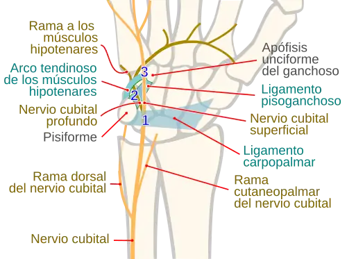 - ↑ a b c d e Aleksenko, Dmitri; Varacallo, Matthew (2019). Guyon Canal Syndrome. StatPearls Publishing. PMID 28613717. Consultado el 3 de abril de 2019.