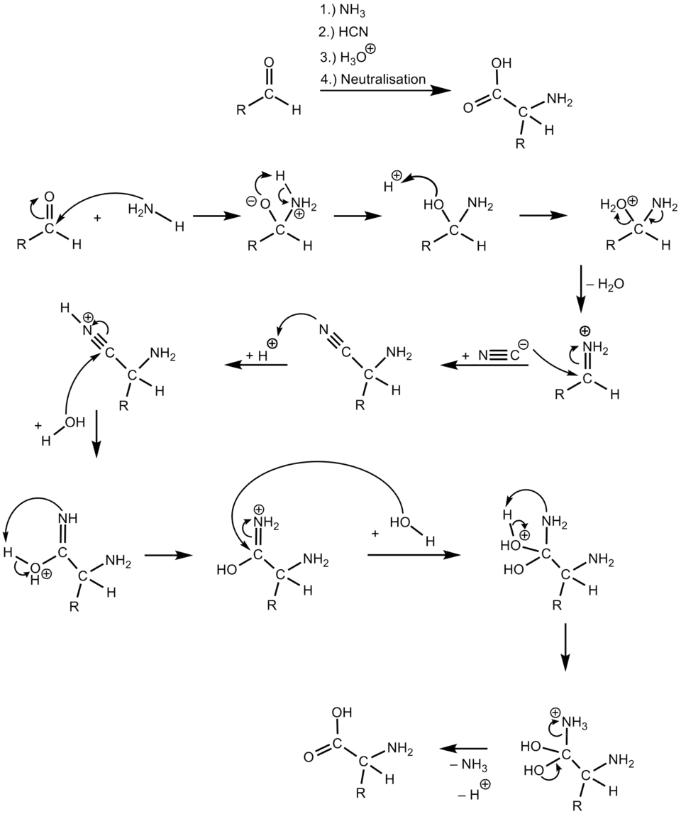 El compuesto carbonílico condensa con cloruro de amonio a una imina, que en presencia de cianuro sufre la adición de este para formar un α-aminonitrilo, el cual es seguidamente hidrolizado para conseguir el aminoácido deseado.