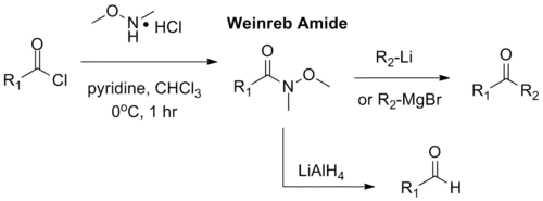 Nahm y Weinreb también informaron de la síntesis de aldehídos por la reducción de la amida con un exceso de hidruro de litio y aluminio (Ver reducción de la amida ).