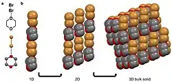 Un enlace halógeno se produce cuando un haluro electronegativo participa en una interacción no covalente con un átomo menos electronegativo de una molécula adyacente.[10][29] Ejemplos de sólidos moleculares que presentan enlaces halógenos son el hexaclorobenceno[11][30] y un cocristal de bromo 1,4-dioxano.[27] En el segundo ejemplo, el átomo de bromo δ- de la molécula de bromo diatómica se alinea con el oxígeno menos electronegativo del 1,4-dioxano. En este caso, el oxígeno se considera δ+ en comparación con el átomo de bromo. Esta coordinación da lugar a una organización en forma de cadena que se apila en 2D y luego en 3D.[27]