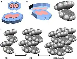 Un cuadrupolo, como un dipolo, es un polo permanente pero el campo eléctrico de la molécula no es lineal como en la acetona, sino en dos dimensiones.[25] Ejemplos de sólidos moleculares con cuadrupolos son el octafluoronaftaleno y el naftaleno.[17][25] El naftaleno está formado por dos anillos conjugados unidos. La electronegatividad de los átomos de este sistema de anillos y la conjugación provocan una corriente anular que da lugar a un cuadrupolo. En el caso del naftaleno, este cuadrupolo se manifiesta en un δ- y un δ+ que se acumulan dentro y fuera del sistema de anillos, respectivamente.[4][5][6][10][25] El naftaleno se ensambla mediante la coordinación del δ- de una molécula con el δ+ de otra,[4][5][6] lo que da lugar a columnas 1D de naftaleno en un patrón de espiga. A continuación, estas columnas se apilan en capas 2D y luego en materiales a granel 3D. El octafluoronaftaleno sigue este camino de organización para construir materiales a granel, excepto que el δ- y el δ+ están en el exterior y el interior del sistema de anillos, respectivamente.[5]
