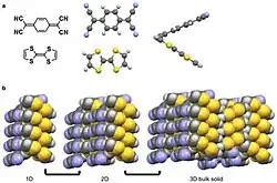Las interacciones coulombianas se manifiestan en algunos sólidos moleculares. Un ejemplo bien estudiado es la sal iónica radical TTF-TCNQ con una conductividad de 5 x 102 Ω-1 cm-1,[5] mucho más cercana al cobre (ρ = 6 x 105 Ω-1 cm-1)[8] que muchos sólidos moleculares.[32][18][31] La interacción coulombiana en el TTF-TCNQ se debe a la gran carga negativa parcial (δ = -0,59) de la molécula ciano del TCNQ a temperatura ambiente.[5] Como referencia, una molécula completamente cargada δ = ±1.[5] Esta carga negativa parcial provoca una fuerte interacción con la molécula tiol del TTF. La fuerte interacción conduce a una alineación favorable de estos grupos funcionales adyacentes entre sí en estado sólido,[5][32] mientras que las interacciones π-π hacen que el TTF y el TCNQ se apilen en columnas separadas.[10][32]
