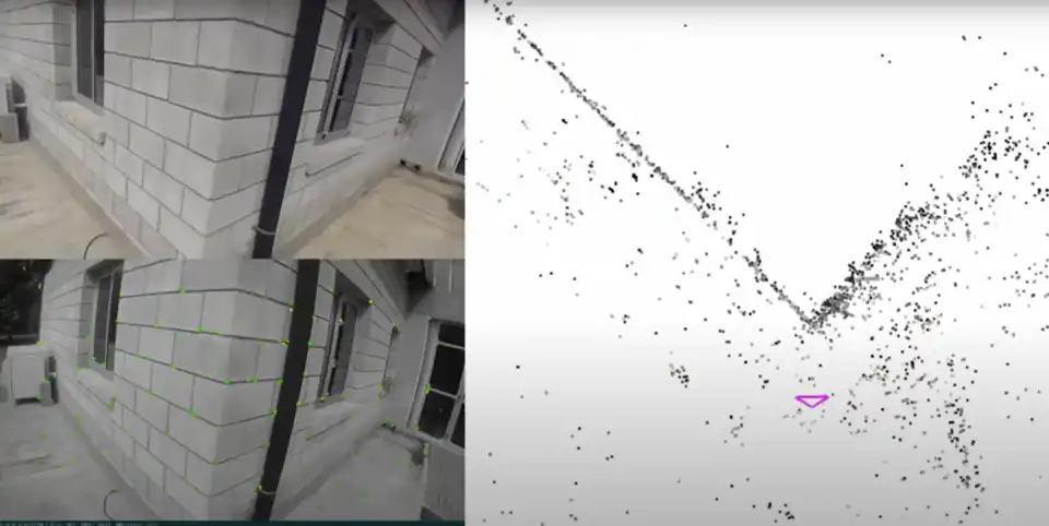 SLAM visual indirecto, ORB-SLAM2.[1]​ A la izquierda dos versiones de la misma imagen: la esquina de un laboratorio. A la derecha se observa una vista superior de la nube de puntos del mapa. Se reconoce claramente la esquina del laboratorio y las dos paredes. La pirámide lila representa la localización de la cámara en el mapa.