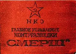 - ↑ Vinogradov, Alexey; Pleysier, Albert (10 de julio de 2012). «Glossary of Names Titles and Abbreviations» [Glosario de nombres, títulos y abreviaturas]. Unlocked Memories: Young Russians under German Rule [Recuerdos desbloqueados: Jóvenes rusos bajo el dominio alemán] (en inglés). Lanham, Md.: University Press of America. p. 123. ISBN 9780761853275. OCLC 670479225. Archivado desde el original el 14 de junio de 2020. Consultado el 24 de febrero de 2023. «SMERSH was an acronym for Smert' Shpionam which is translated Death to Spies. It [...] was given the name SMERSH by Joseph Stalin who rejected the originally proposed title Death to German Spies. Stalin believed that the new intelligence service should concern itself with all spies.»