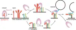 También se ha sugerido que la Munc18 actúa como un catalizador de la fusión, permaneciendo asociada con el péptido N-terminal de la sintaxina para después volverse a unir al complejo SNARE de cuatro hélices recién formado.[11] Este posible mecanismo de disociación y reasociación con los dominios SNARE podría depender de la presencia de calcio.[12]