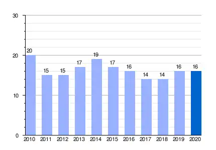 | Gráfica de evolución demográfica de Saíñas entre 2010 y 2020 |