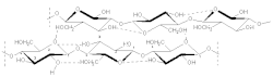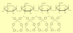 - Amilosa: Compuesta por 1.000 a 5.000 unidades de D-glucosa, lo cual da una masa molecular entre 160 y 800 kDa. Las glucosas se asocian entre sí por enlaces glucosídicos α(1→4), formando largas cadenas. Este tipo de unión permite una disposición helicoidal de la cadena, enrollada alrededor de un eje central. Cada vuelta de hélice abarca seis unidades de glucosa. Los grupos hidroxilo de los restos monosacáridos se disponen hacia el exterior, lo cual deja el interior de la hélice convertido en un ambiente relativamente hidrófobo. En agua, las moléculas de amilosa tienden a asociarse y precipitar, razón por la cual no forman soluciones estables. La reacción con iodo es utilizada para el reconocimiento de almidón (esta reacción química se conoce como prueba del yodo). El complejo amilosa-iodo es responsable del color azul intenso, mientras que aquel constituido por iodo y amilopectina da una coloración que varía entre el rojo y el violeta.[26] El diámetro interno de la hélice de amilosa es suficientemente amplio para alojar moléculas de iodo. Esta coloración desaparece al calentar, ya que se rompe la estructura que se ha producido.[27]