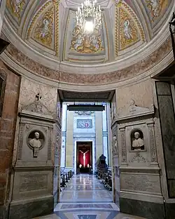 La sacristía se encuentra precedida de un espacio denominado antesacristía de gusto neoclásico que cuenta con un monumento en honor del cardenal Giuseppe Alberghini.[3]Asimismo, la antesacristía alberga otros monumentos fúnebres neoclásicos dedicados a Clara Colonna, la escocesa Carolina Monteith, el conde Giovanni Villani y monseñor Ignacio Alberghini.[4]