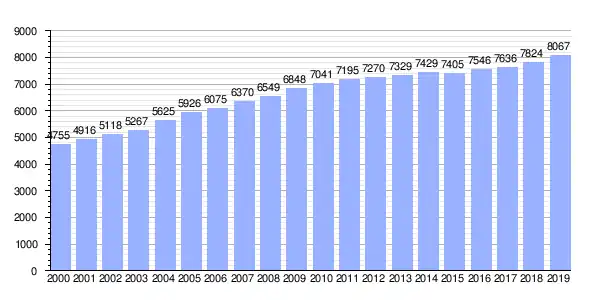 | Gráfica de evolución demográfica de Sada (parroquia) entre 2000 y 2019 |