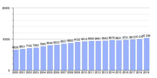 | Gráfica de evolución demográfica de Sada (lugar) entre 2000 y 2019 |