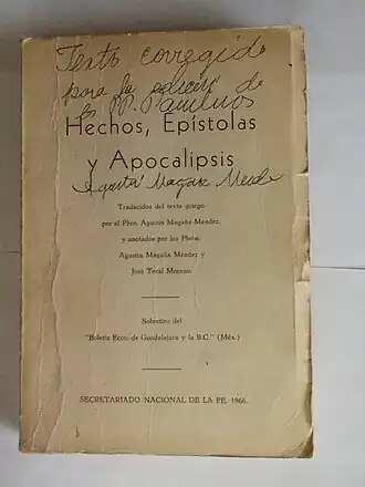 ![]() Hechos, Epístolas y Apocalipsis. Una de las primeras ediciones de la traducción de la Biblia de la Burrita del P. Agustín Magaña Méndez, realizada por el Boletín Eclesiástico de Guadalajara (1966). | ||