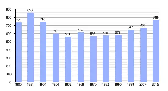 Los datos demográficos contemplados en este gráfico de la comuna de Saint-Angeau[4] se han cogido de 1800 a 1999 de la página francesa EHESS/Cassini, y los demás datos de la página del INSEE.[5]