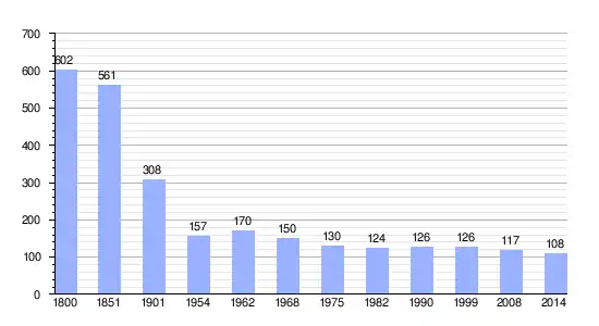 Los datos demográficos contemplados en este gráfico de la comuna de Saint-Aubert-sur-Orne[4] se han cogido de 1800 a 1999 de la página francesa EHESS/Cassini, y los demás datos de la página del INSEE.[5]