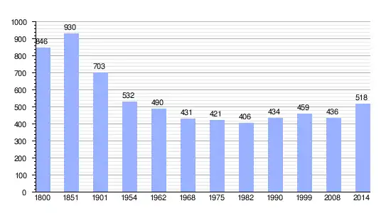 Los datos demográficos contemplados en este gráfico de la comuna de Saint-Céneré[5] se han cogido de 1800 a 1999 de la página francesa EHESS/Cassini, y los demás datos de la página del INSEE.[6]