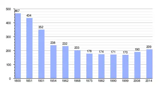 Los datos demográficos contemplados en este gráfico de la comuna de Saint-Charles-de-Percy[4] se han cogido de 1800 a 1999 de la página francesa EHESS/Cassini, y los demás datos de la página del INSEE.[5]