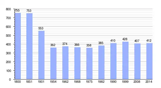 Los datos demográficos contemplados en este gráfico de la comuna de Saint-Georges-de-Bohon[4] se han cogido de 1800 a 1999 de la página francesa EHESS/Cassini, y los demás datos de la página del INSEE.[5]
