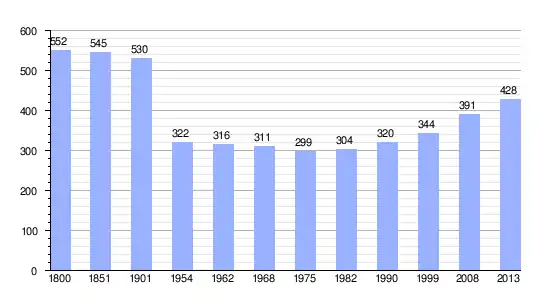 Los datos demográficos contemplados en este gráfico de la comuna de Saint-Georges-du-Bois[4] se han cogido de 1800 a 1999 de la página francesa EHESS/Cassini, y los demás datos de la página del INSEE.[5]