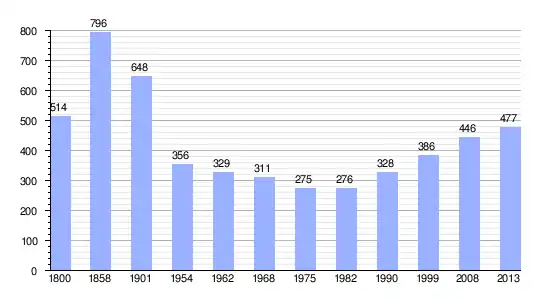 Los datos demográficos contemplados en este gráfico de la comuna de Saint-Germain-la-Chambotte[4] se han cogido de 1800 a 1999 de la página francesa EHESS/Cassini, y los demás datos de la página del INSEE.[5]