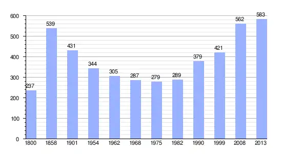 Los datos demográficos contemplados en este gráfico de la comuna de Saint-Girod[4] se han cogido de 1800 a 1999 de la página francesa EHESS/Cassini, y los demás datos de la página del INSEE.[5]