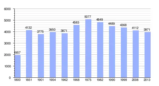 Los datos demográficos contemplados en este gráfico de la comuna de Saint-Hilaire-du-Harcouët[3] se han cogido de 1800 a 1999de la página francesa EHESS/Cassini, y los demás datos de la página del INSEE.[4]