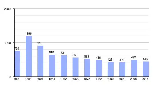 Los datos demográficos contemplados en este gráfico de la comuna de Saint-Jean-sur-Erve[4] se han cogido de 1800 a 1999 de la página francesa EHESS/Cassini, y los demás datos de la página del INSEE.[5]