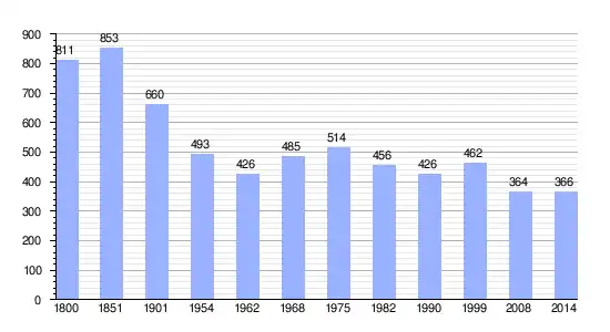 Los datos demográficos contemplados en este gráfico de la comuna de Saint-Jores[4] se han cogido de 1800 a 1999 de la página francesa EHESS/Cassini, y los demás datos de la página del INSEE.[5]